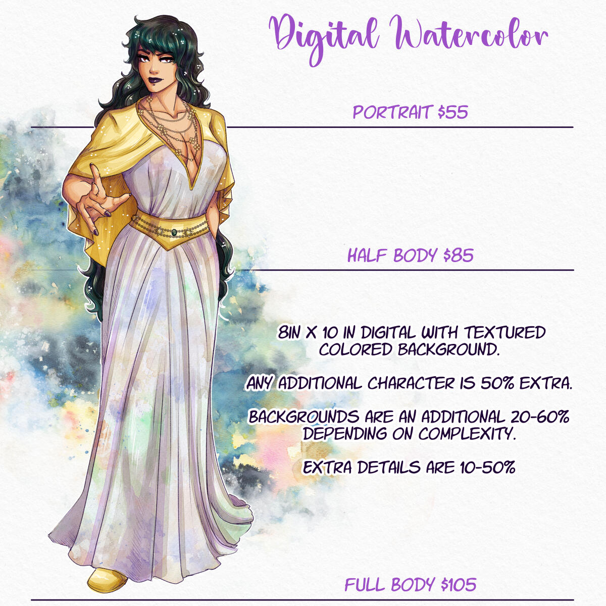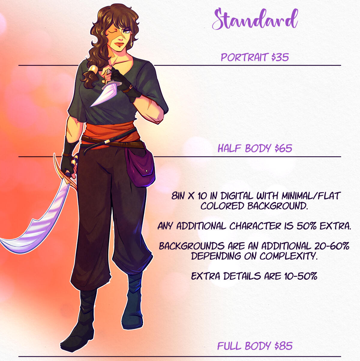 - 8in x 10 in digital painting with minimal/flat colored background.-Any additional character is 50% extra.-Backgrounds are an additional 20-60% depending on complexity.-Extra details are 10-50%